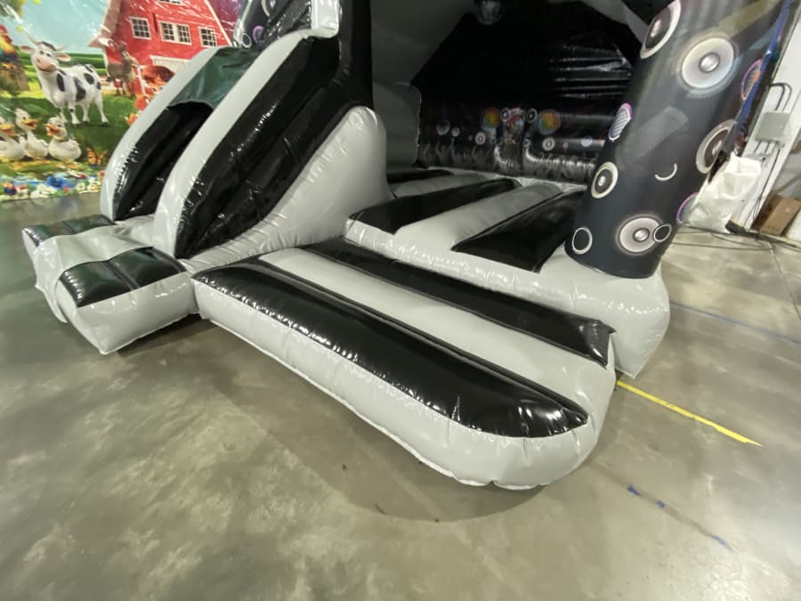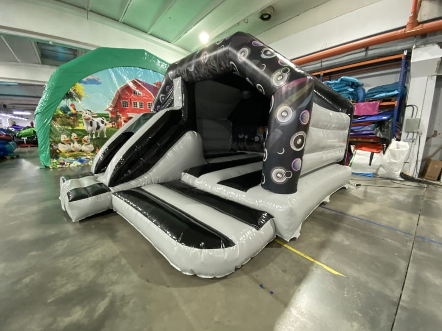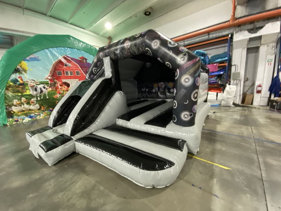 With its spacious design, children can bounce around freely, while the built-in slide adds an extra element of excitement. The vibrant black and grey color scheme adds a touch of style to any event, making it visually appealing for both kids and adults.