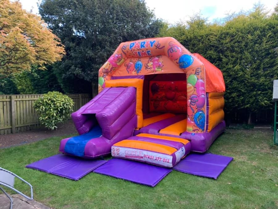 Looking for the perfect addition to your party? Look no further than our Orange and Purple Castle with Slide and Roof! This vibrant and exciting play structure is designed to bring endless fun and adventure to kids of all ages.