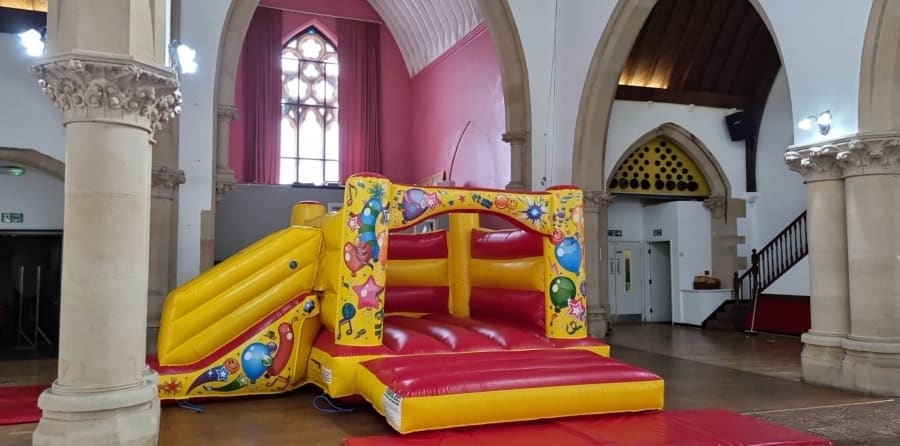 🚚 We offer bouncy castle hire services in Stanley, Consett, Washington, Chester Le Street, Gateshead, Sunderland, and County Durham. Contact us today to book our red and yellow bouncy castle with slide for your next event!