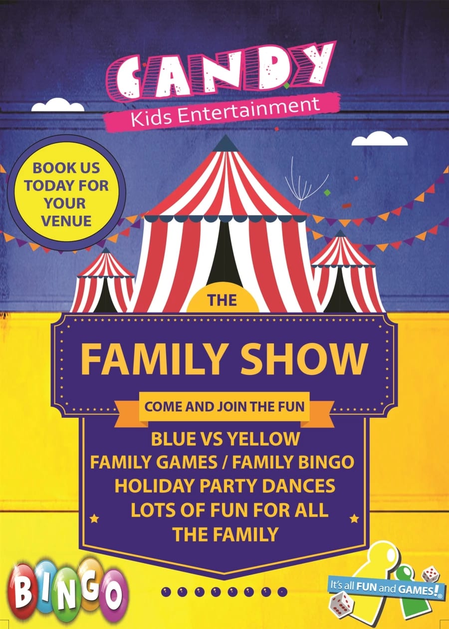 BLUE VS YELLOW FAMILY SHOW FAMILY FUN GAMES / HOLIDAY PARTY DANCES AND GAMES / LOTS OF MADNESS / FAMILY BINGO / PLUS LOTS OF PRIZES fancy something different book the blue vs yellow party for your pub / club or event how you can make money off this event 1 you can sell tickets 2 sell hot and cold food 3 sell hot and cold food 4 sell bingo tickets Book us online today